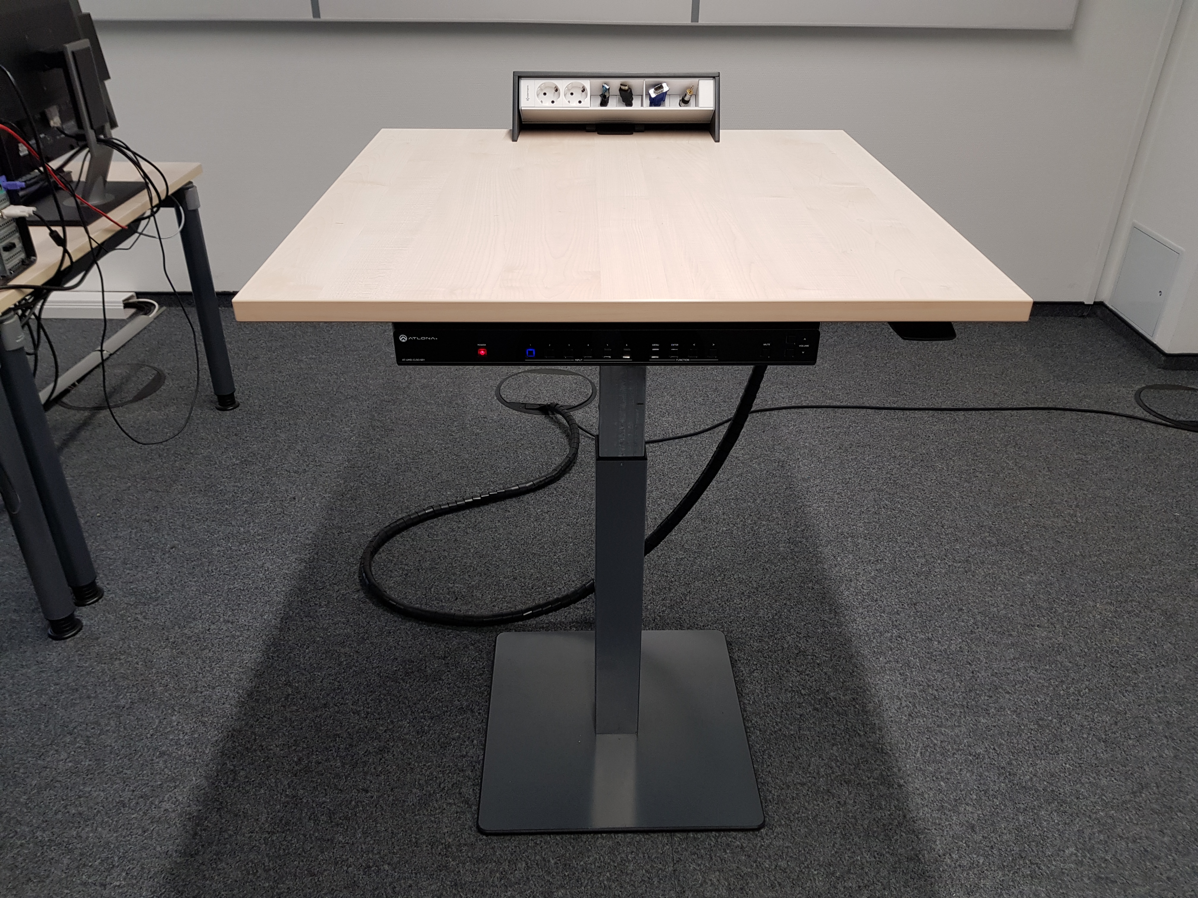 All lecterns can be equipped with microphones. The large variants have the options of a console microphone, a wearable and a portable microphone rod that can be borrowed at the GSG in the rooms 0.009, 0.010, 0.014 and 0.015 if required. The smaller lecterns have a mounting space for a wireless microphone unit, which can also be borrowed on demand in our offices. Please allow some time for the necessary preparation of the lectern when choosing this option.